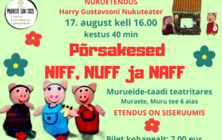 17. augustil kell 16.00Etenduse kestus 40 min.Murueide-taadi teatritaresMuraste, Muru tee 6 aiasEtendus on siseruumisPilet kohapealt 7.00 eur Lully Gustavsoni nukunäidend „Põrsakesed Niff, Nuff ja Naff“ on kirjutatud tuntud muinasjutu põhjal.Kas tõesti saabub pärast suvetralli sügis oma külmade, tuulte ja vihmadega? Kelle vastu peaksid põrsakesed end kaitsma? Kas põrsa maja peab [...]